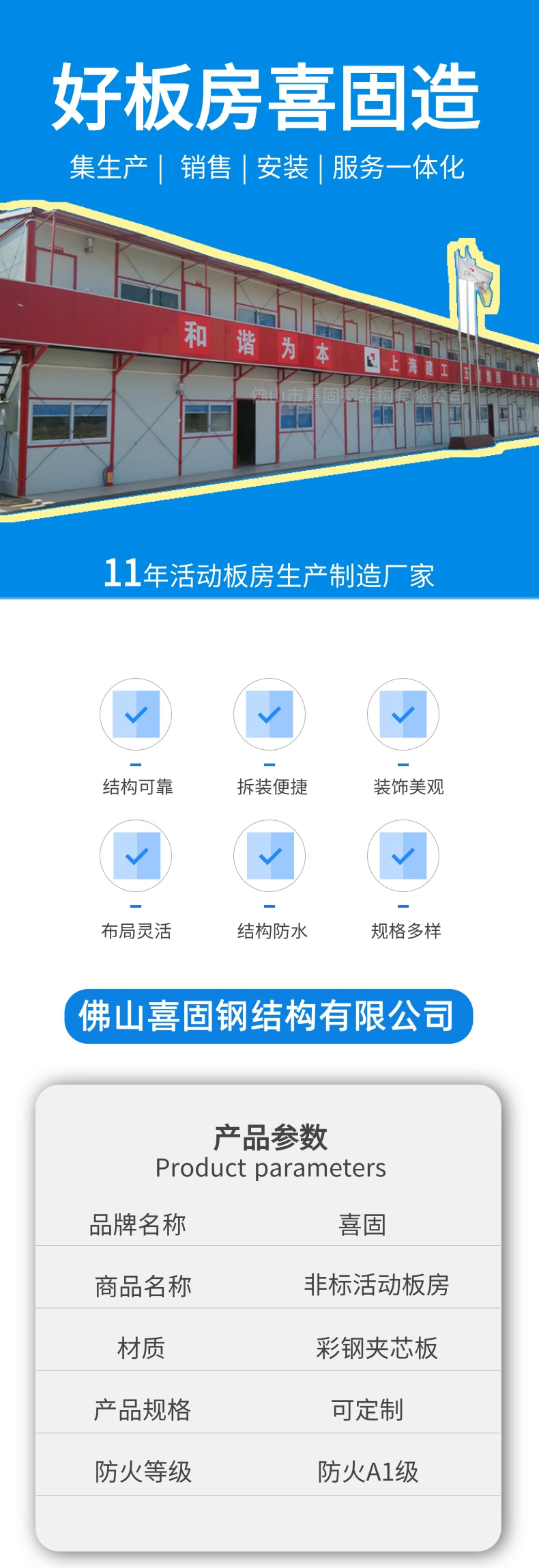 喜固定制活動板房是一種以輕鋼為骨架,以夾芯板為圍護材料,以標準模數(shù)系列進行空間組合,彩鋼活動板房構件采用螺栓連接,全新概念的環(huán)保經(jīng)濟型彩鋼活動房屋。