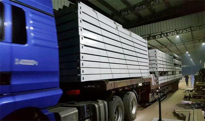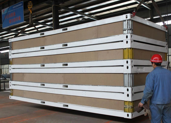 1).標(biāo)準(zhǔn)化生產(chǎn)、配件打包運輸。拼裝式集裝箱房,用標(biāo)準(zhǔn)模塊配件的空間拼裝組合,整體結(jié)構(gòu)均采用輕鋼結(jié)構(gòu)為骨架,安全性能極高。主要模塊配件有頂板及頂框、底板及底框、墻板、角柱等,所有產(chǎn)品構(gòu)件均由工廠預(yù)制,標(biāo)準(zhǔn)化生產(chǎn)。其突出特點在于構(gòu)件生產(chǎn)完成后打包運輸至現(xiàn)場組裝,單個集裝箱構(gòu)配件打包后所占體積為6000mmx3000mmx50mm,普通平板貨車單次運輸數(shù)量可達到8個,與傳統(tǒng)固定式集裝箱單次運輸1-2個相比較,運輸效率提高4~8倍,見圖1和圖2。